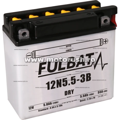 Conventional lead acid battery (dry charged), delivered dry, including acid pack, JIS standard 12N5.5-3B, 12V 5,5Ah CCA 55 A, Dimensions 135x60x130mm